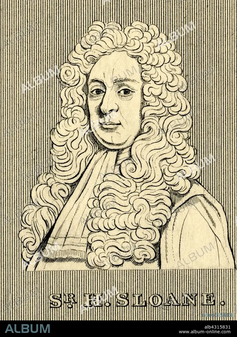 Caption: 'Sir H. Sloane', (1660-1753), 1830. Sir Hans Sloane (1660-1753) Irish physician, naturalist and collector whose donations founded the British Museum, British Library and Natural History Museums in London. Elected to the Royal College of Physicians by age 27 he travelled to Jamaica, witnessed cruelty to slaves and discovered cocoa. From "Biographical Illustrations", by Alfred Howard. [Thomas Tegg, R. Griffin and Co., J. Cumming, London, Glasgow and Dublin, 1830]