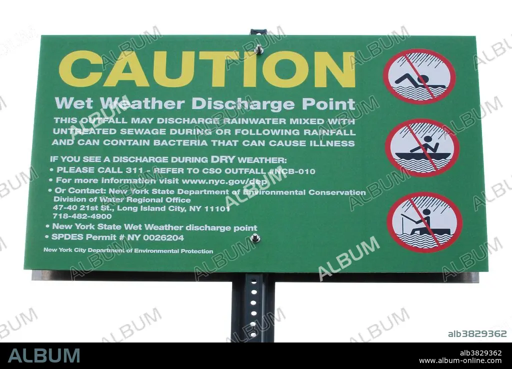 Caption: Sewage discharge point warning sign. Sign warns that raw sewage will be discharged here into the East River during heavy rainfall.