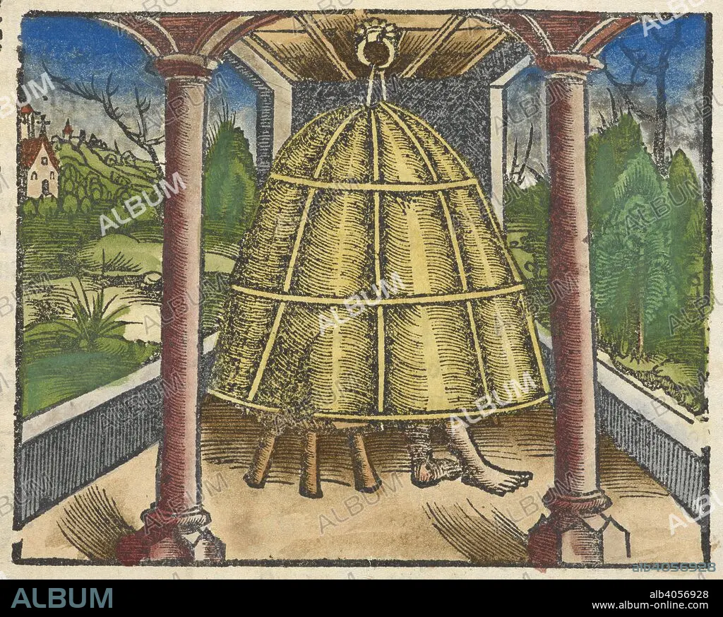Caption: Coloured woodcut showing a person inside a container suspended from a roof. Das buch zu distillieren die zusamen gethonen ding Composita genant, durch die eintzigē ding, und das buch Thesaurus pauperū, für die armen ... geoffenbart, etc. [With woodcuts.]. Durch I. Grüninger: Strassburg, 1519. Source: C.64.g.7 page CCXCr.