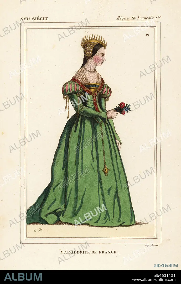 Caption: Marguerite de Navarre, Marguerite de Valois, Margaret of France, daughter of King Francis I of France 1523-1574. Handcoloured lithograph by Leopold Massard after a portrait in Roger de Gaignieres' portfolios from Le Bibliophile Jacob aka Paul Lacroix's Costumes Historiques de la France (Historical Costumes of France), Administration de Librairie, Paris, 1852.