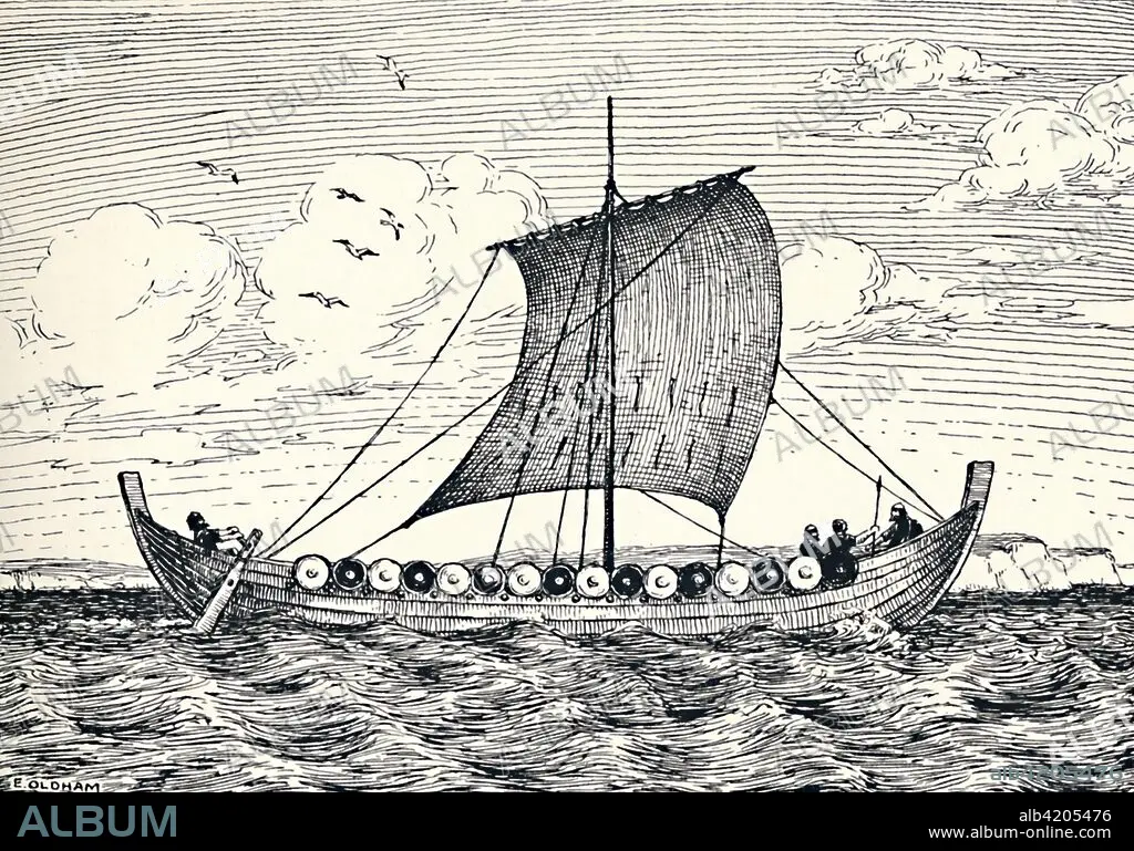 Caption: 'The Gokstad Ship - A reconstruction', 1935. Modern imagining of how the 9th-century Viking ship would have looked under sail. Used for a Viking ship burial, the Gokstad Ship was excavated in 1880 in Sandar, Norway. From A History of the Anglo-Saxons, Vol. II, by R. H. Hodgkin. [The Clarendon Press, Oxford, 1935]