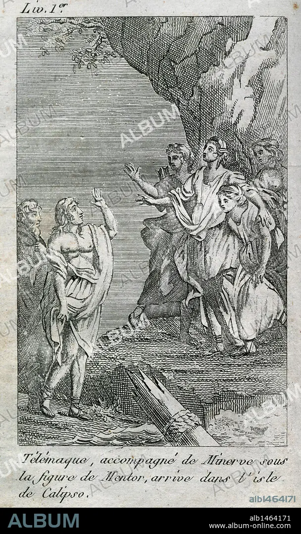 Caption: Francois Fenelon (1651-1715). French archbishop, theologian and writer. The Adventures of Telemachus, 1699. Engraving depicting Telemachus with MInerva arrives on the island of Calypso. Book One. Prince Edition. Episcopal Library of Barcelona. Spain.