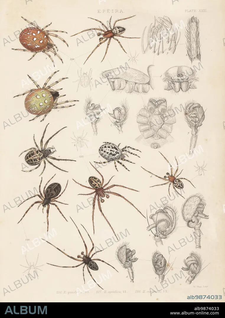 Caption: Four-spot orb-weaver, Araneus quadratus (Epeira quadrata) 236, furrow spider, Larinioides cornutus (E. apoclisa) 237, and bridge spider, Larinioides sclopetarius (E. sericata) 238. Handcoloured lithograph by W. West from John Blackwalls A History of the Spiders of Great Britain and Ireland, Ray Society, London, 1861.