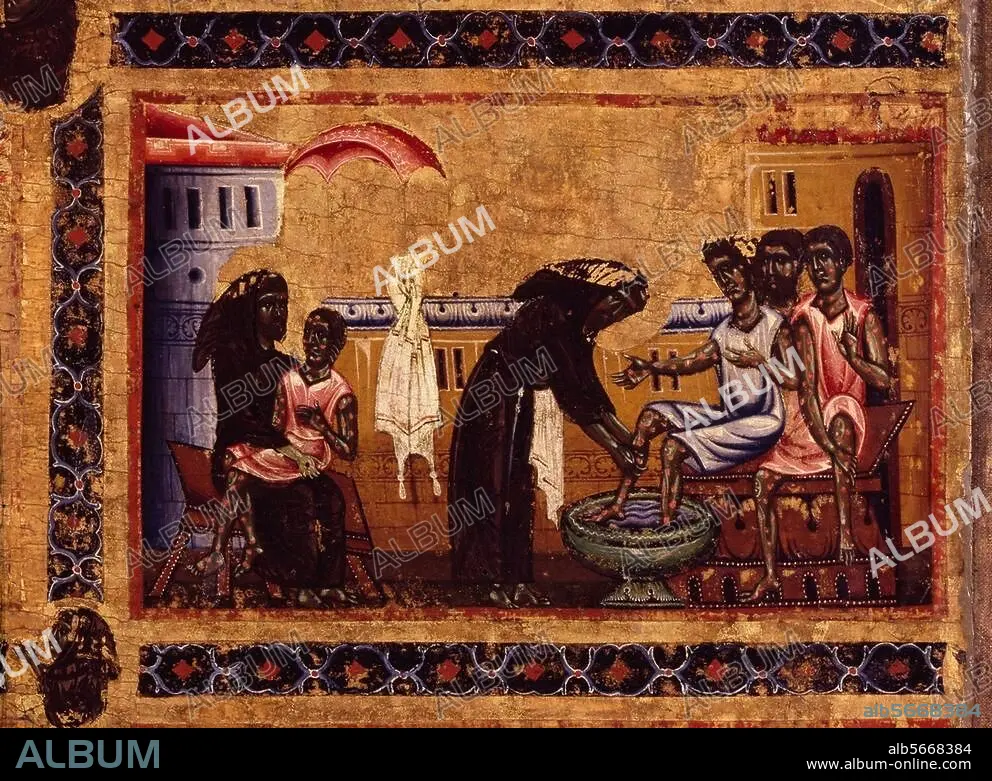 Caption: Bonaventura Berlinghieri (attributed to). active 1228-1274. "St. Francis Nurses Leper". Detail of the altar panel depicting scenes from the life of St. Francis. On wood. Florence, S. Croce (Bardi-Chapel). (Photo: Stefan Diller).