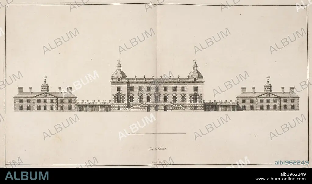 Front elevation of Houghton Hall, Norfolk. A stately home and very large house with two wings and central building. Palladian architecture. The plans, elevations, and sections, chimneys pieces, and ceilings of Houghton Hall. London, 1735. The plans, elevations, and sections, chimneys pieces, and ceilings of Houghton ... in Norfolk; the seat of ... Sr R. Walpole ... Published by I. W. Source: 649.b.9 6-7. Language: English.