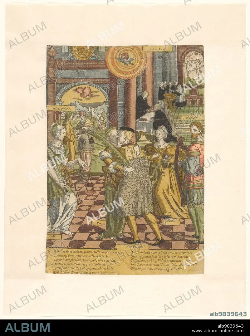 The reunification and forgiveness of the prodigal son, c.1540-c.1550. Son (Filius Prodigus) is embraced by Peace (Pax). Around them are justice (Justicia), joy (Laeticia) and steadfastness (Constantia). Above them the Holy Spirit. In the background the father in conversation with personification of the Jewish people (Gens Judaica), two men going to slaughter a cow, and a church interior (Ecclesia) with the baptism of a child and the Eucharistic celebration. Print from a series of six woodcuts with six-line Latin captions. The woodcut is hand-coloured where the costumes have been adjusted / modernized.