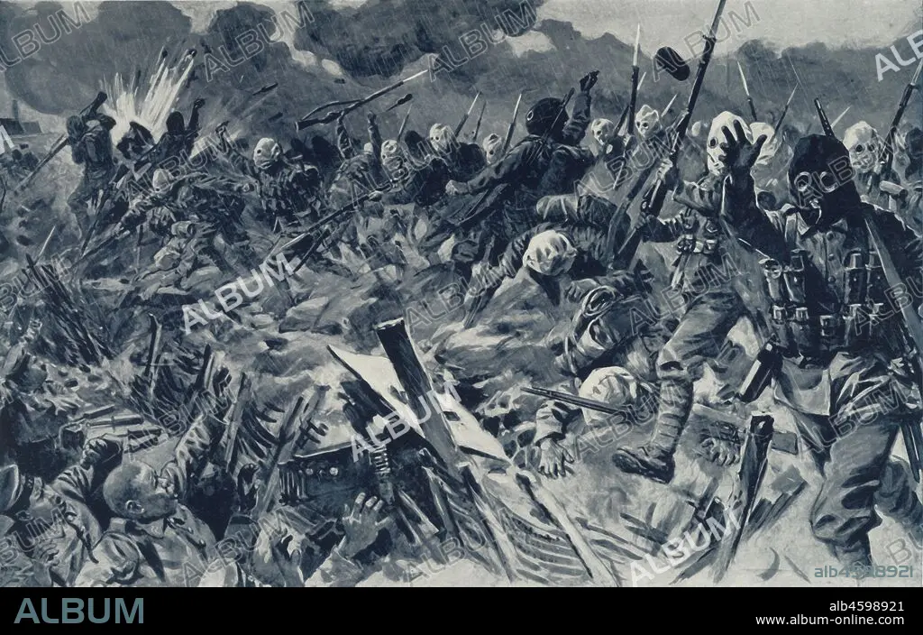 Title: 'Hooded British Territorials charging the German Trenches at Loos, September 25th, 1915', 1916. Creator: Unknown.