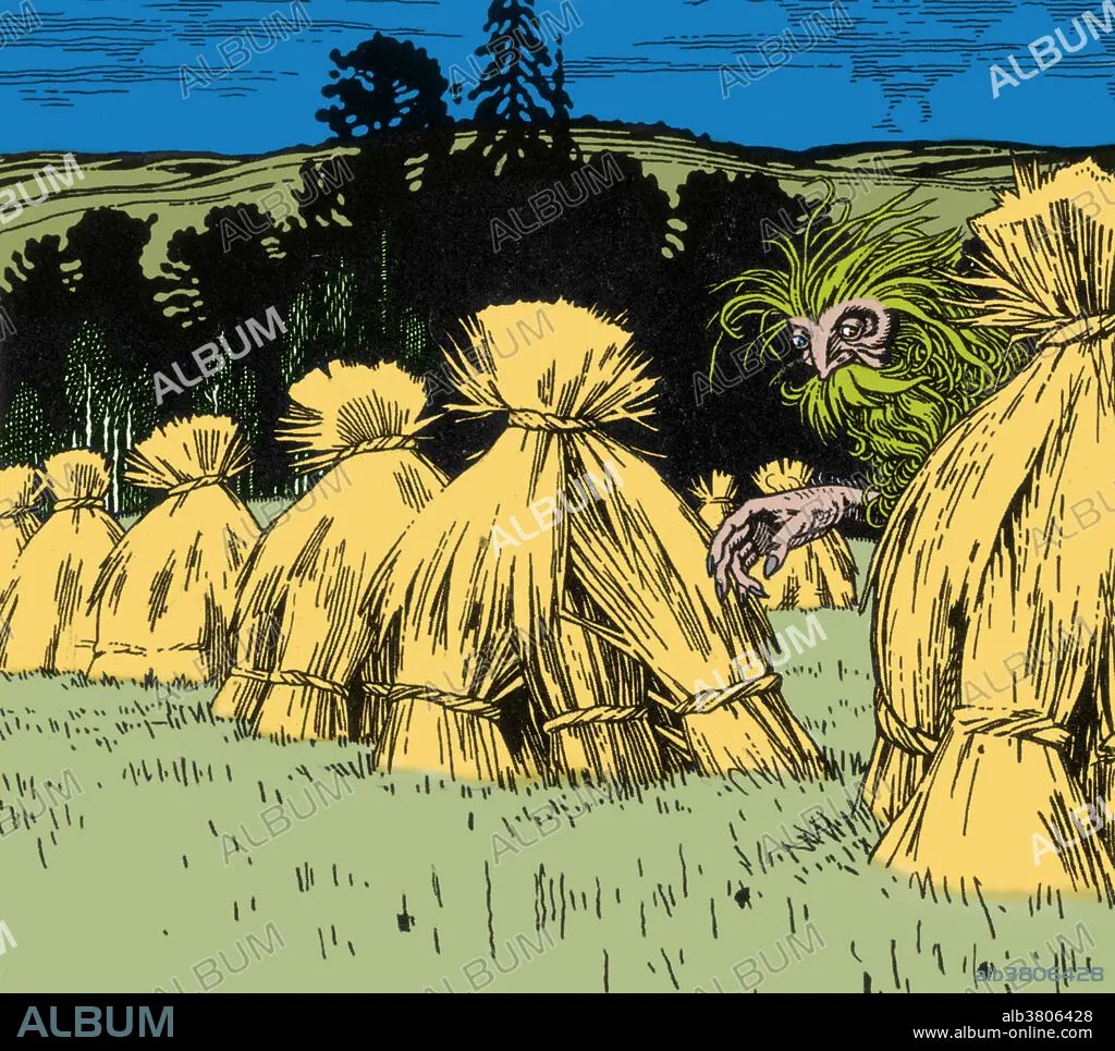 Caption: Polevik in Polish mythology are field spirits that appear as a deformed dwarfs with different colored eyes and grass instead of hair. They appear either at noon or sunset and wear either all black or all white suits. According to local beliefs they lead wandering people in a field astray, give them diseases or ride them over with their horses if they are found asleep. If a person falls asleep on the job after drinking, the Poleviki might murder them. Appeasing the Polevik requires two eggs, a rooster, a toad, and a crow placed in a ditch when no one is looking. Ivan Yakovlevich Bilibin (August 16, 1876 - February 7, 1942) was a Russian illustrator and stage designer who was inspired by Slavic folklore. He gained renown in 1899, when he released his illustrations of Russian fairy tales. He died in 1942 during the Siege of Leningrad at the age of 65.