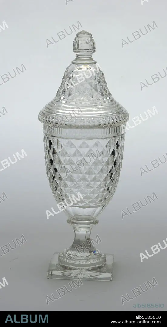 Caption: Jar and lid, Glass, Slender urn-shaped body, cut with shallow diamond pattern all over, a row of thin fluting top edge, wider fluting at base; fluted stem on square base cut with star on bottom; tall bell-shaped cover cut with shallow diamonds and prismatic rings, faceted finial., England, ca. 1830, glasswares, Decorative Arts, Jar and lid