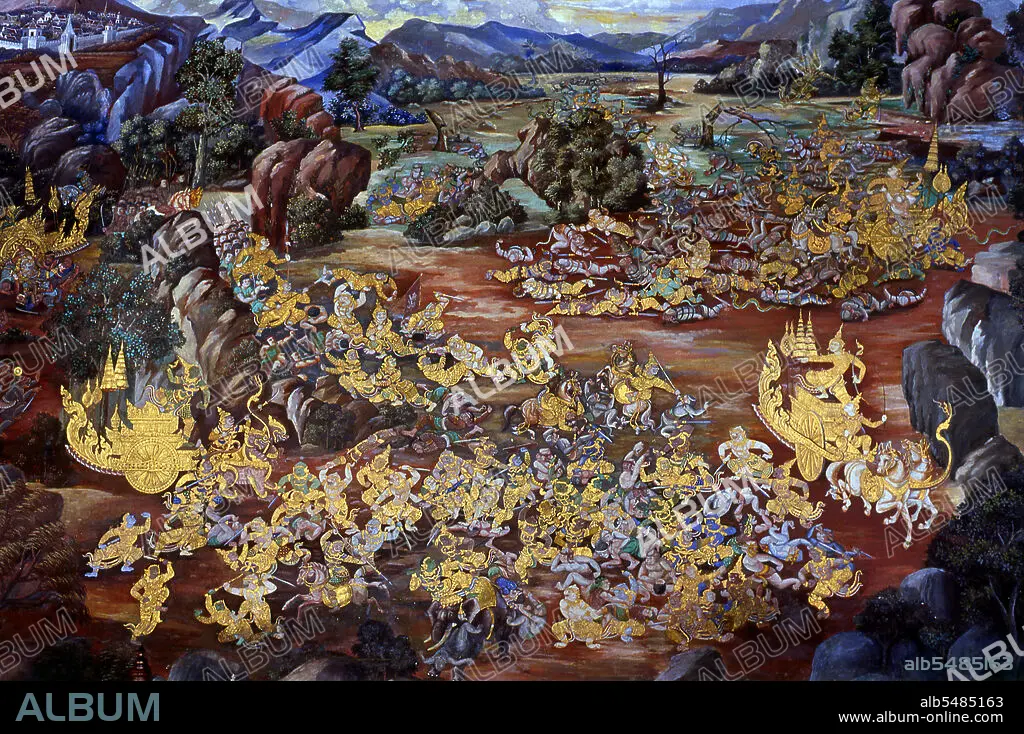 Title: Epic battle between Rama and Totsagan, Ramakien murals, Wat Phra Kaeo, Bangkok.