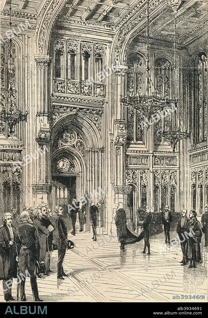 Caption: The Members' Lobby is a hallway in the Palace of Westminster used by members of the House of Commons, the lower house of the Parliament of the United Kingdom. Members of Parliament may congregate here for informal discussions. The Members' Lobby was restored after its destruction in World War II. The bomb-damaged arch at the entrance to the Commons was retained. It is now known as the Churchill Arch. Here we see the Lobby in its original state, before its near destruction in the blitz. From a 'Pictorial Record of Remarkable Events in The History of the World', published by James Sangster and Co., c1910.