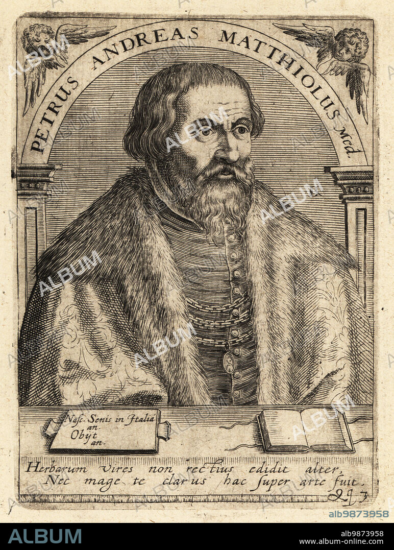 Pietro Andrea Gregorio Mattioli, Italian physician and naturalist born in Siena, 1501-1577. Petrus Andreas Matthiolus Medicus. Copperplate engraving by Johann Theodore de Bry from Jean-Jacques Boissards Bibliotheca Chalcographica, Johann Ammonius, Frankfurt, 1650.