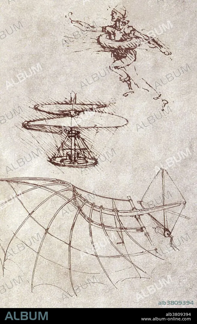 Caption: Drawings by Leonardo Da Vinci showing a life preserver, the aerodynamics of vertical flight, and a wooden wing operated by a hand crank.