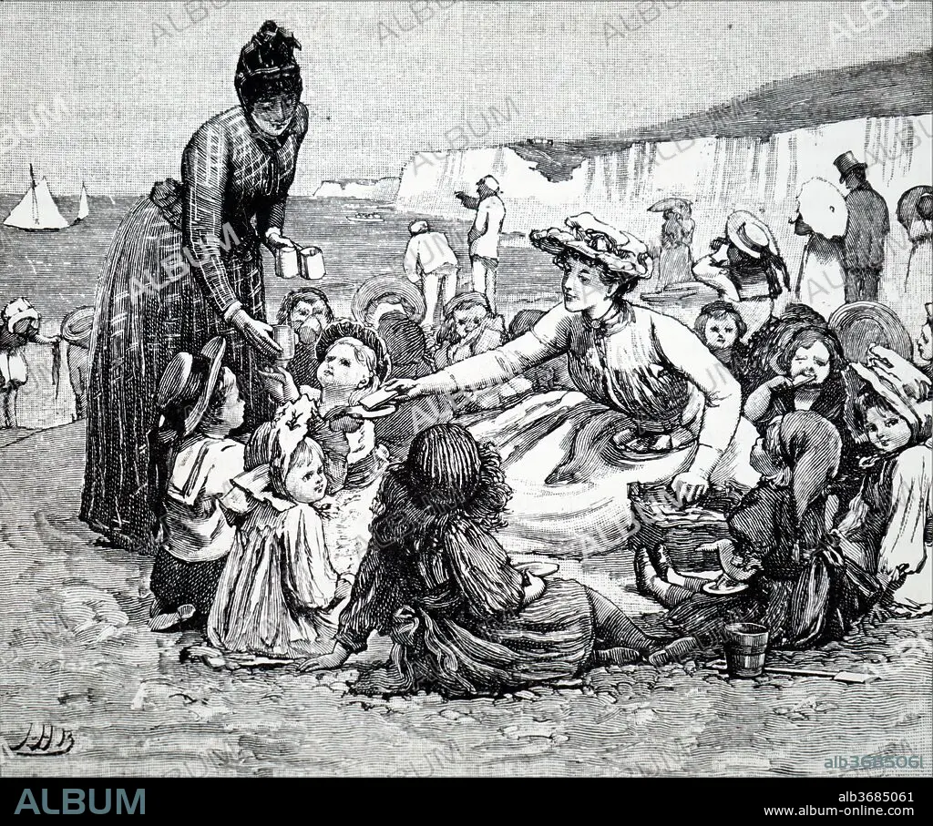 Illustration depicting a seaside outing for poor children. Dated 19th century.