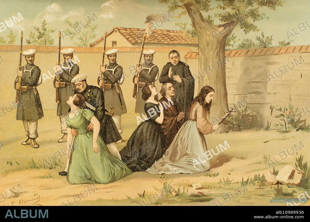 Caption: History of Spain. First Carlist War (1833-1840). By order of the Carlist general Ramón Cabrera, on 27 February 1836, the wife of Colonel Fontiveros (María Roque) and three other women, Cinta Foz, Francisca Urquizu and Mariana Guardia, were shot in an orchard in Valderrobres (province of Teruel, Aragon), merely because they belonged to liberal families. These executions, along with many others ordered by Cabrera, were in reprisal for the execution of his mother a few days earlier. Illustration by J. Alaminos. Chromolithography. "Historia de la guerra civil y de los partidos liberal y carlista" (History of the Civil War and the Liberal and Carlist parties), by Antonio Pirala. Volume II. Madrid, 1890.