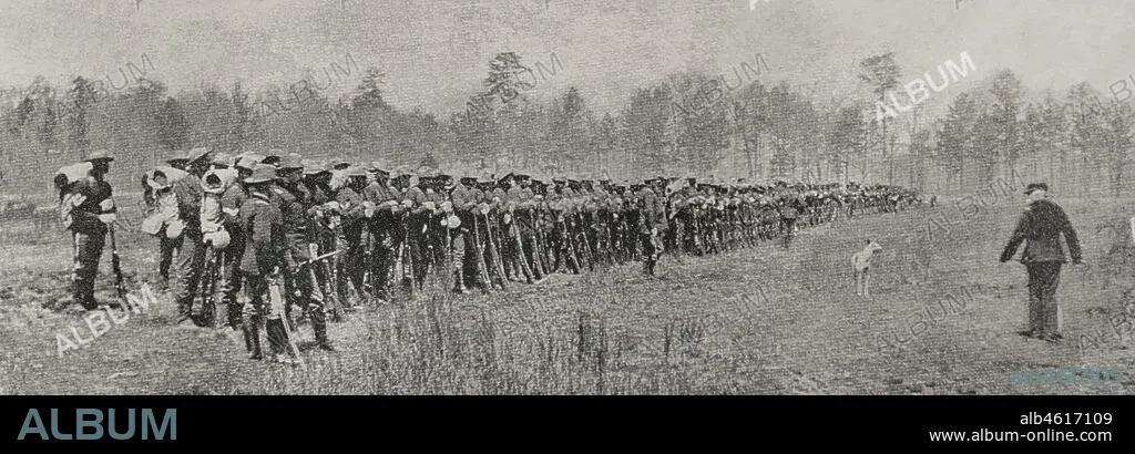 Spanish-American War (1898). Reconcentration of American troops. The 25th Infantry Regiment (1866-1946) at Chickamauga. This unit was one of the racially segregated ones in the United States Army. Photoengraving. La Ilustración Española y Americana, 1898.