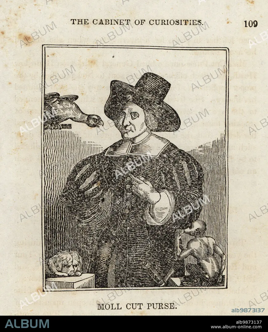 Mary Frith, Moll Cut Purse, the Roaring Girl, English transvetite criminal of the reign of King Charles II. Fortune teller, pickpocket and fence or receiver of stolen goods from Mulled Sack and others. Portrait with parrot and monkey, c.1584-1659. Woodcut from The Cabinet of Curiosities, or Wonders of the World Displayed, Henry Piercy, New York, 1836.