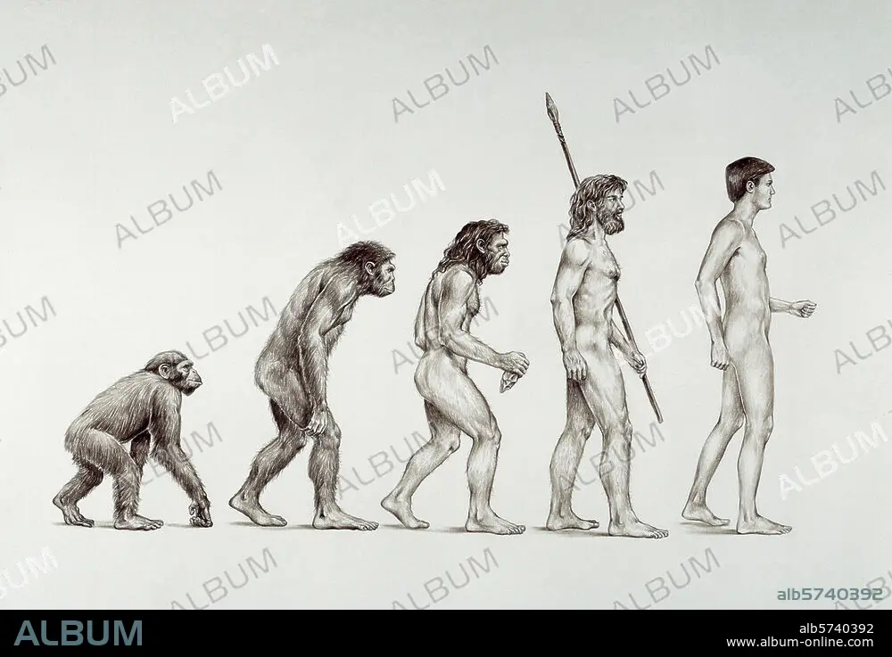Caption: Anthropology:. History of Man. Evolution from ape to Homo erectus, Homo neanderthalensis to Homo sapiens. Drawing, 1998, by Johann Brandstetter. (born 1959). Owned by the artist.