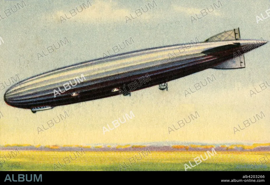 USS Los Angeles airship, 1920s, (1932). The Los Angeles, (Zeppelin works number LZ 126), was built for the US military as part of reparations that Germany was compelled to pay after World War I. It was flown from Friedrichshafen to Lakehurst, New Jersey, USA, taking 81 hours and 2 minutes. She remained in service until being dismantled in 1940. From "Die Eroberung Der Luft", (The Conquest of the Air), cigarette card album produced by the Garbáty cigarette factory, 1932. Eugene and Moritz Garbáty, who were Jewish, were driven out of business by the Nazis in the late 1930s, and forced to sell their factory which lay empty for over 70 years. [Garbaty Cigarettenfabrik, Berlin-Pankow, 1932]