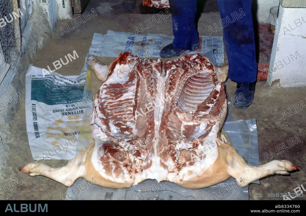 Automatic translation: OPEN PIG IN CARCASS- PHOTO YEARS 70