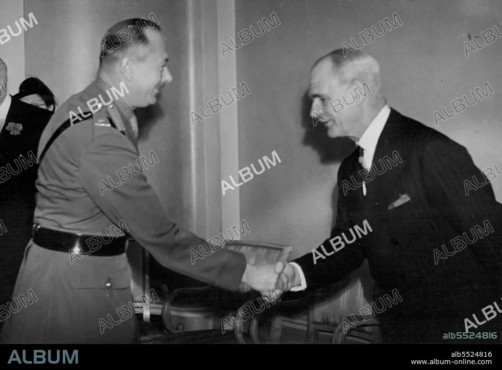Caption: Royal Empire Society Reception at the Dorchester -- Field Marshal Lord Wavell, Victory designate of India greeting H.R.H. The Duke of Gloucester on his arrival at the reception.A reception was held at the Dorchester, which was a farewell gathering to field-Marshal Lord Wavell H.R.H. The Duke of Gloucester attended the Reception, and wished Lord Wavell success and God-speed. September 23, 1943.