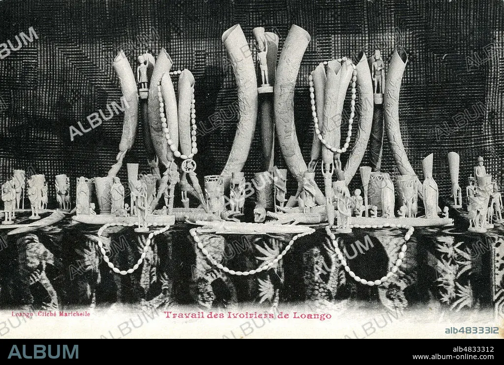'Travail des ivoiriers de Loango'. Sculptures sur defenses d'elephants. Carte postale vers 1910. Credit : IM/KHARBINE-TAPABOR.