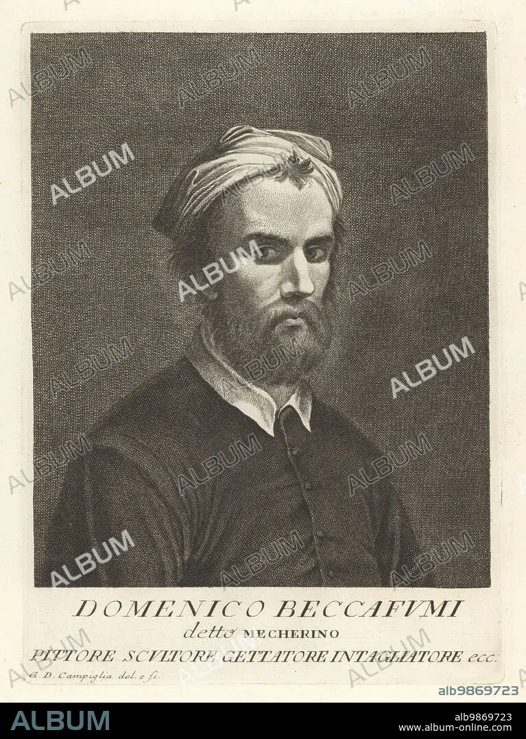 Caption: Domenico Beccafumi, Italian Renaissance-Mannerist painter active predominantly in Siena, 1486-1551. Also sculptor, mosaicist, and engraver. Known as il Mecherino or il Mecarino. Pittore, Scultore, Gettatore, Intagliatore. Copperplate engraving drawn and engraved Giovanni Domenico Campiglia after a self portrait by the artist from Francesco Moucke's Museo Florentino (Museum Florentinum), Serie di Ritratti de Pittori (Series of Portraits of Painters) stamperia Mouckiana, Florence, 1752-62.