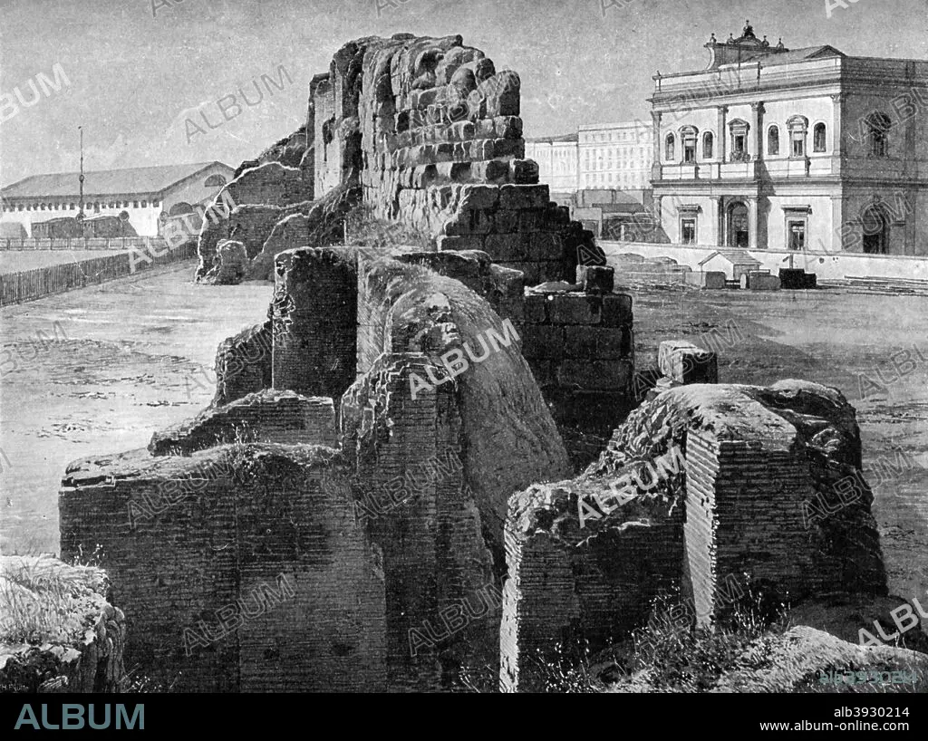 Caption: Remains of the Servian wall near the railway station, Rome, 1902. View of the defensive barrier built round the city in the early 4th century BC. Illustration from 'The World's History, The Mediterranean Nations, by Dr H F Helmolt, Volume IV, published by William Heinemann, (London, 1902).