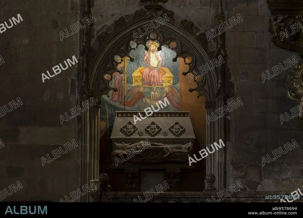 Caption: sepulcro medieval de Ramón Torrella, primer obispo de Mallorca tras la conquista de Jaime I, Catedral de Mallorca, La Seu, siglo XIII. gótico levantino, palma, Mallorca, balearic islands, Spain