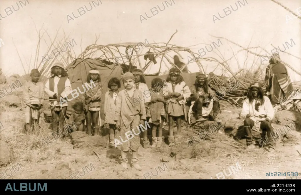 Caption: The captive white boy, Santiago McKinney in Geronimo's Camp, with group of Indians, mostly children, in front of partially constructed tent, before Geronimo's surrender to Gen. Crook, March 27, 1886