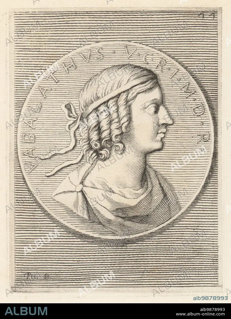 Caption: Septimius Vaballathus, c. 259-274 AD, child emperor of the Palmyrene Empire under his regent mother Septimia Zenobia. Head of a boy in royal diadem. Bust from a bronze coin. Vabalato. Vabalathus V C R IM D R. Copperplate engraving by Etienne Picart after Giovanni Angelo Canini from Iconografia, cioe disegni d'imagini de famosissimi monarchi, regi, filososi, poeti ed oratori dell' Antichita, Drawings of images of famous monarchs, kings, philosophers, poets and orators of Antiquity, Ignatio deLazari, Rome, 1699.