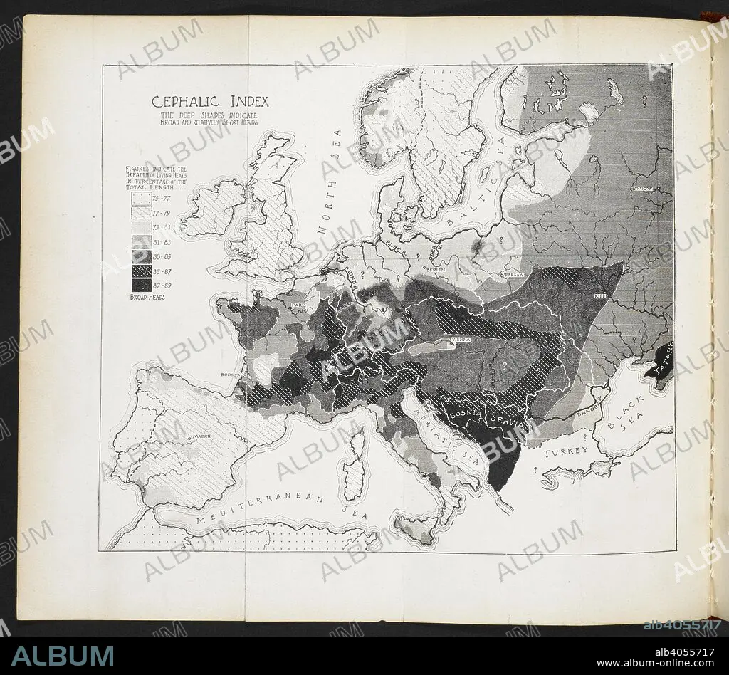 Caption: Cephalic Index of Europe. The Races of Europe: a sociological study. Lowell Institute Lectures ... Accompanied by a supplementary bibliography of the anthropology and ethnology of Europe, published by the Public Library of the City of Boston. New York : D. Appleton & Co., 1899. Source: W49/4706 facing p.53.