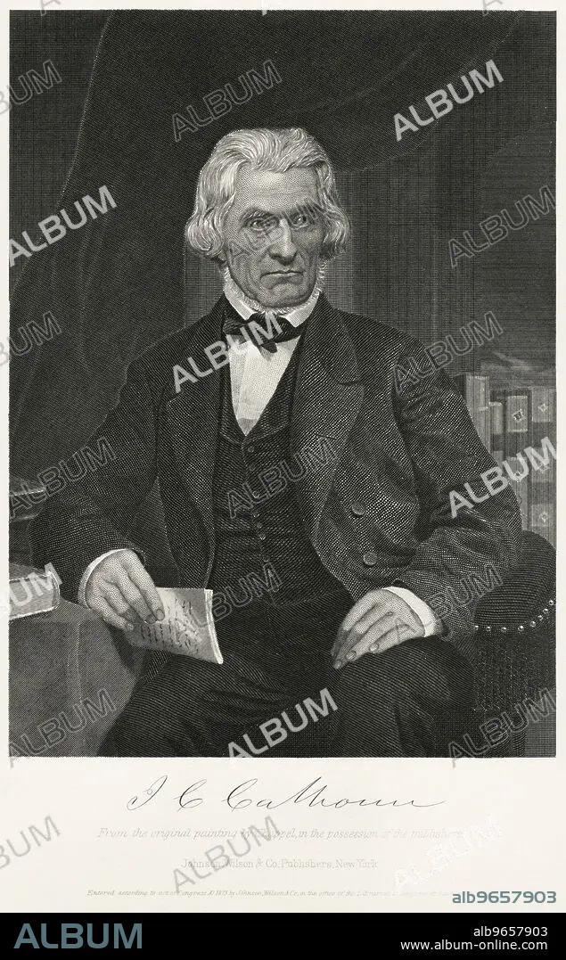 Caption: John C. Calhoun (1782-1850), American Statesman, 7th Vice President of the United States 1825-32 and U.S. Senator from South Carolina 1845-50, Seated Portrait, Steel Engraving, Portrait Gallery of Eminent Men and Women of Europe and America by Evert A. Duyckinck, Published by Henry J. Johnson, Johnson, Wilson & Company, New York, 1873