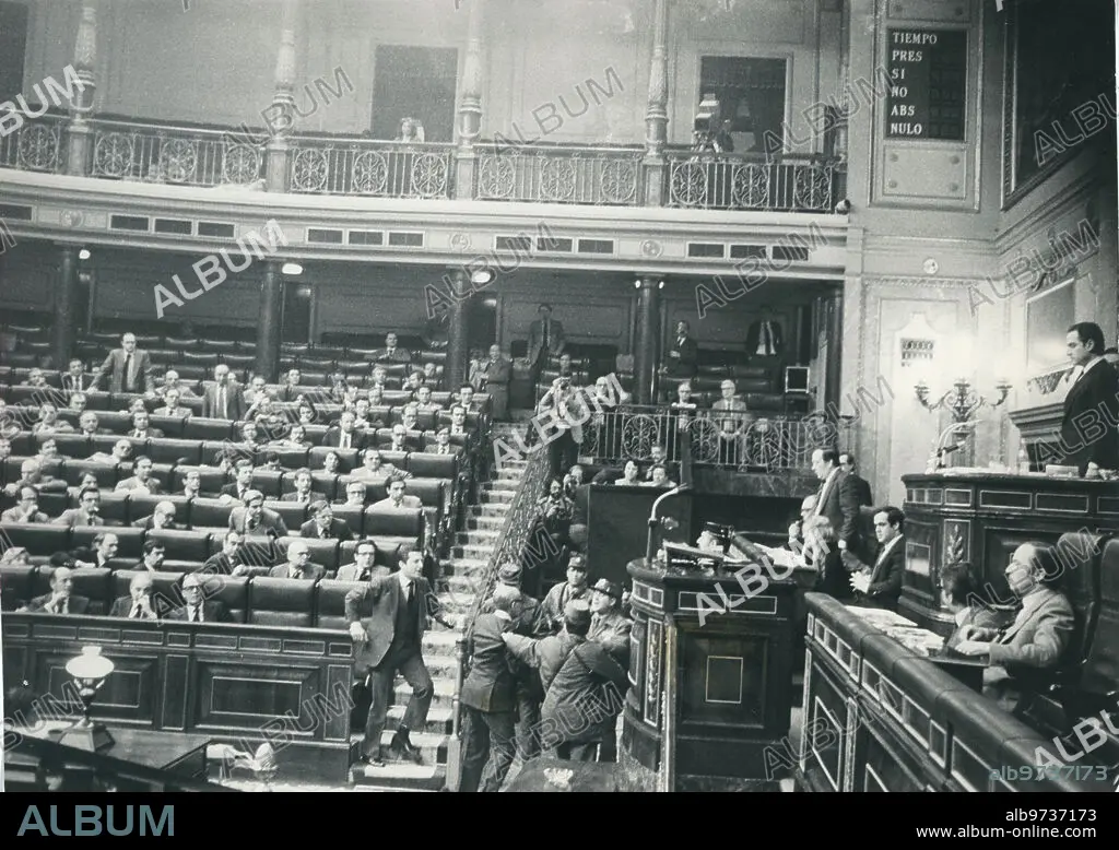 Caption: Madrid, 02/23/1981. Coup d'état of February 23. Lieutenant General D. Manuel Gutiérrez Mellado, First Vice President of the Government for Defense Affairs, stood up in his seat, next to that of Adolfo Suárez, and faced the assailants. This can be seen in this photo taken by ABC graphic editor Teodoro Naranjo, who, upon leaving Congress on the 23rd, had cameras and film taken from him, which he was able to recover the next day.