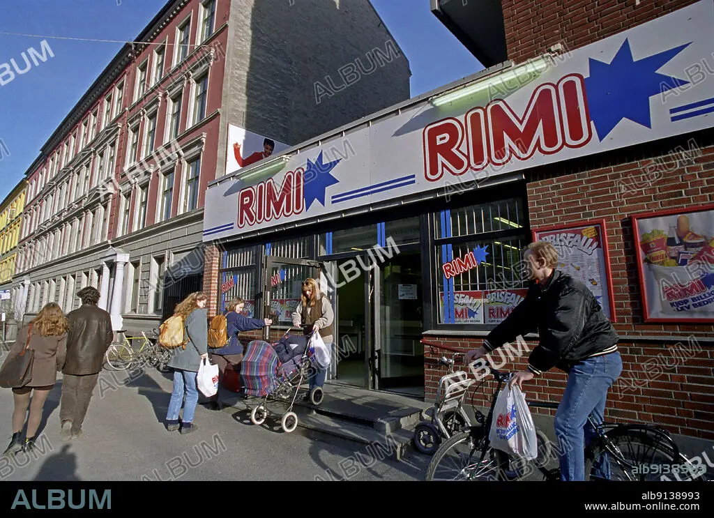 Caption: Oslo 1995-03-21: Grocery store Rimi at St. Hanshaugen, at the intersection Waldemar Thranes gate / Ullevålsveien, March 21, 1995. Young man with rimi plastic bag on bicycle. Young woman with stroller on the way down the stairs. Students with leather transfers. Young couple strolling on the sidewalk at Rosa Bygård. Photo: Bjørn-Owe Holmberg / NTB / NTB