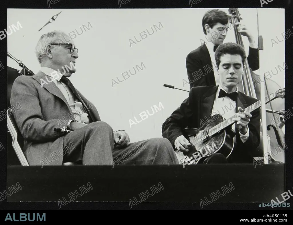 Caption: Benny Goodman watching Phil Flanigan (bass) and Chris Flory (guitar) play, Knebworth, Hertfordshire, 1982.