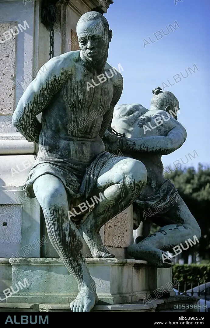 Caption: Statues of the Quattro Mori, "Four Moors", on the monument to Ferdinand I, Livorno, Tuscany, Italy, Europe
