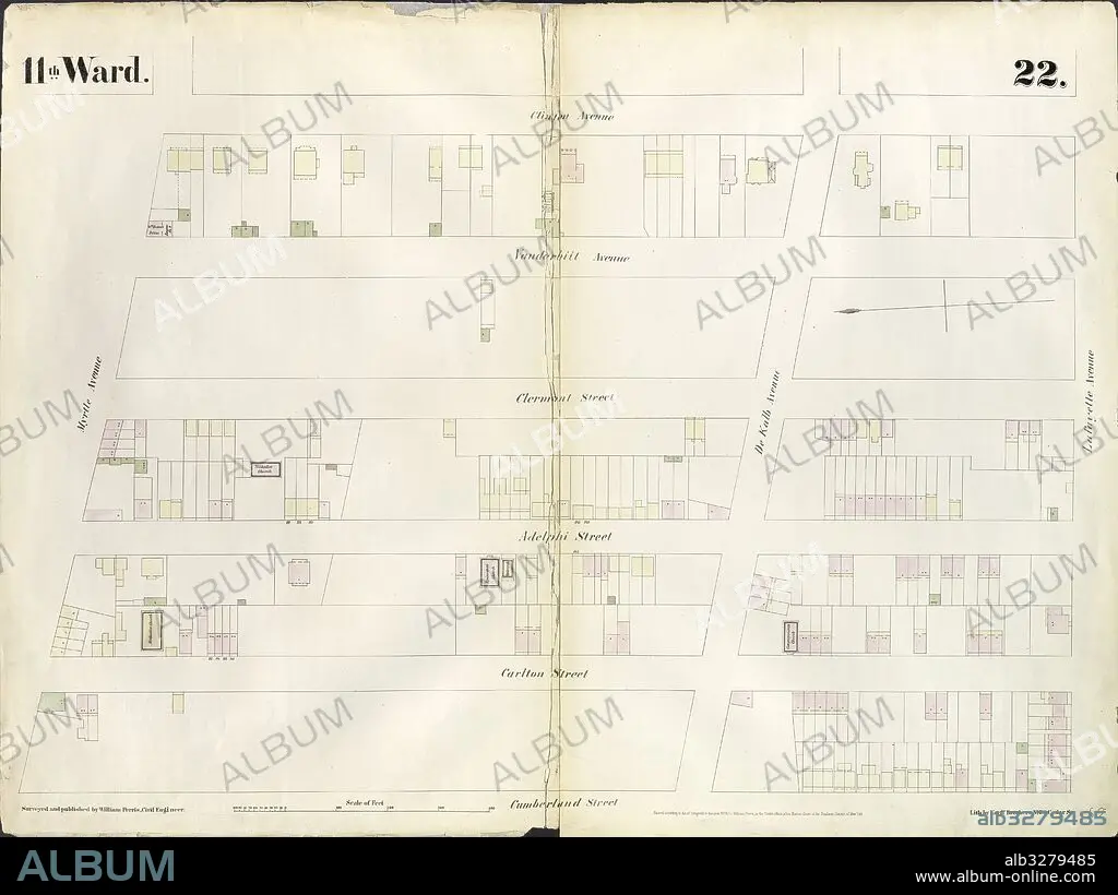 Plate 22: Map bounded by Myrtle Avenue, Clinton Street, Lafayette Avenue, Cumberland Street. 1855, William Perris, Brooklyn, New York, N.Y., USA.