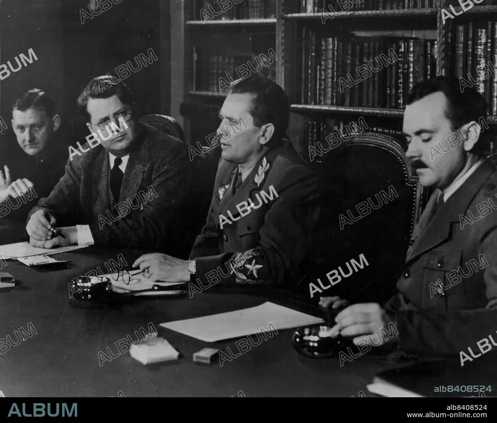 Tito Signs Agreement For UNRRA Aid -- Marshal Tito and UNRRA Deputy Director General Roy F. Hendrickson (glasses) discuss Yugoslav relief agreement with United Nations Relief and Rehabilitation Administration which they signed March 24 in Belgrade. Commander R.G.A. Jackson (extreme left), Senior Deputy Director General, participates, UNRRA is helping Yugoslavia with problems of health, welfare, repatriation, and the importation of relief supplies including food and clothing. Tito's interpreter ***** Petrovich sits at extreme right. April 15, 1947. (Photo by UNRRA Photograph).