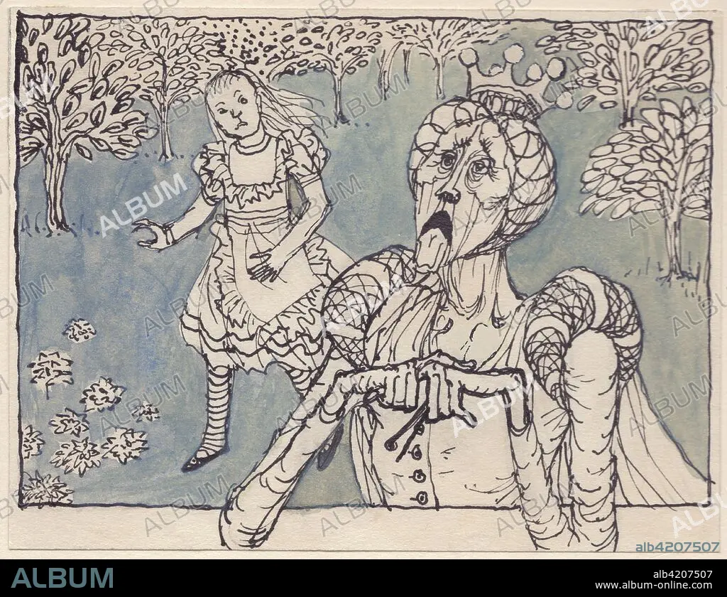 Alice and the White Queen, 1953. Illustration for "Alice Through the Looking-Glass" by Lewis Carroll. Shirley Markham (1931-1999) studied Graphic Design and Illustration at Central School of Art in London from 1950-1952. The writer, artist, poet, and illustrator Mervyn Peake (1911-1968) was one of her tutors, and her style of drawing was also influenced by other British illustrators such as Edward Ardizzone, Quentin Blake and Edward Bawden. Markham spent time in the Dolomite Mountains in Italy, and also visited Rome, sketching classical buildings. After graduating from Central, she worked as a graphic designer, producing book illustrations, cartoons for comics, menus and programmes. She gave up her promising career however when she got married in 1957. Middle-class women at that time were expected to devote their energies to bringing up children and running the home, and despite her obvious talent, she lacked the confidence to return to illustration. Her portfolio remained in the family attic for many years, but now her work is published here for the first time.