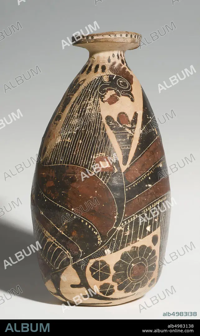 Middle to late Corinthian alabastron. Decoration of bird (cock) with spread wings. The Erlenmeyer Painter. Erlenmyer painter, vase, alabaster, pottery, blackfine, Corinthian, middle Corinthian