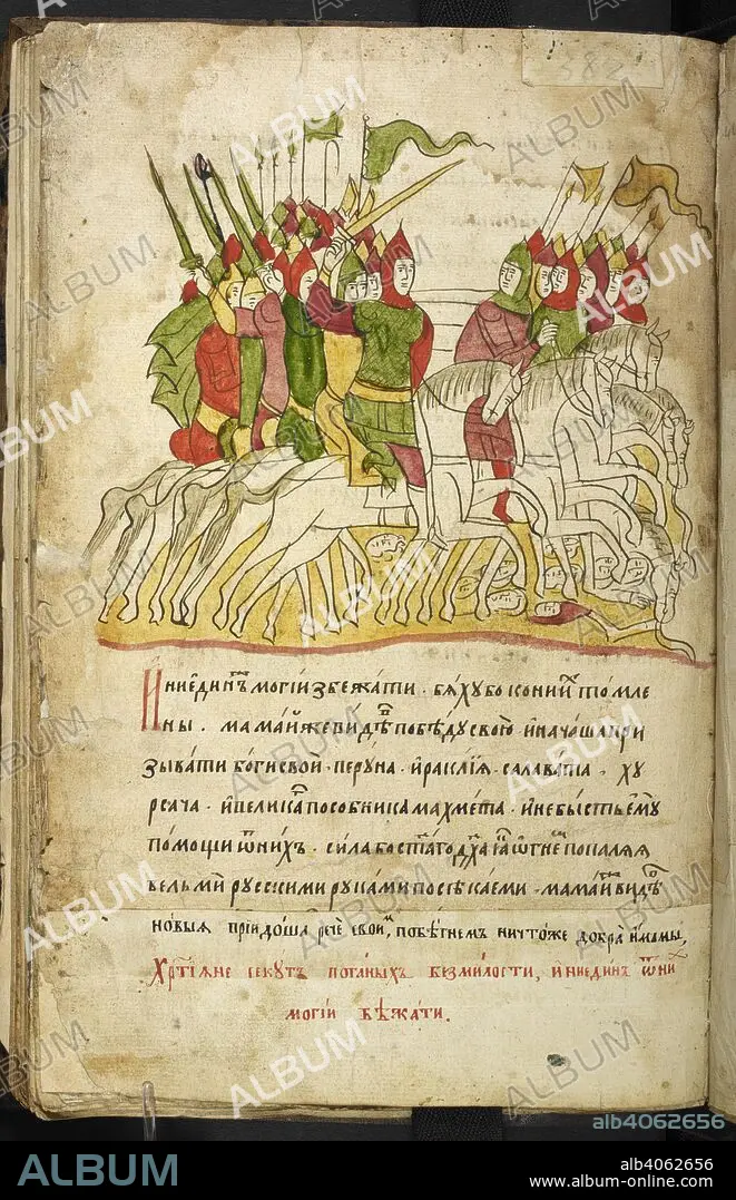 Christian forces overcoming the pagan forces in battle. . Skazanie o Mamaevom Poboishche (the Tale of the Rout of Mamai). 17th century. The Skazanie is a romance in Russian Church Slavonic, composed in the 15th century, relating the struggle of the Muscovian Grand Prince, Dmitri Donskoj (b. 1350, d. 1389), against his Tartar opponent, Mamai (d. 1380), the military commander of the Blue Horde and Golden Horde. The central focus is the battle of Kulikovo (1380) at which Mamai was routed. The victory is presented in the context of a crusade and is couched in terms reminiscent of the contest between Gideon and the Midianites (Judges 7). Source: Yates Thompson 51 f.45v. Language: Russian.