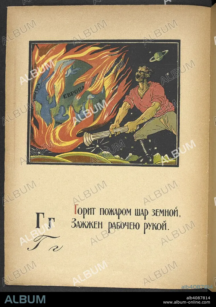 DMITRIĬ STAKHIEVICH MOOR. Гг  Горит пожаром шар земной,  Зажжен рабочею рукой.  The earth burns, set alight by the worker’s hand.  Depicts a Red worker holding a lit torch to the world globe, which is engulfed in flames. Азбука красноармейца / Написал и нарисовал. [Moskva] : [Otdel voennoĭ lit-ry pri Revoli︠u︡t︠s︡ionnom sovete Respubliki]: [Gos. izd-vo], [1921] The department of war literature under the revolutionary military Soviet of the republic. State publishing house. Moscow. Source: Cup.401.g.25 no.2v. Language: Russian.