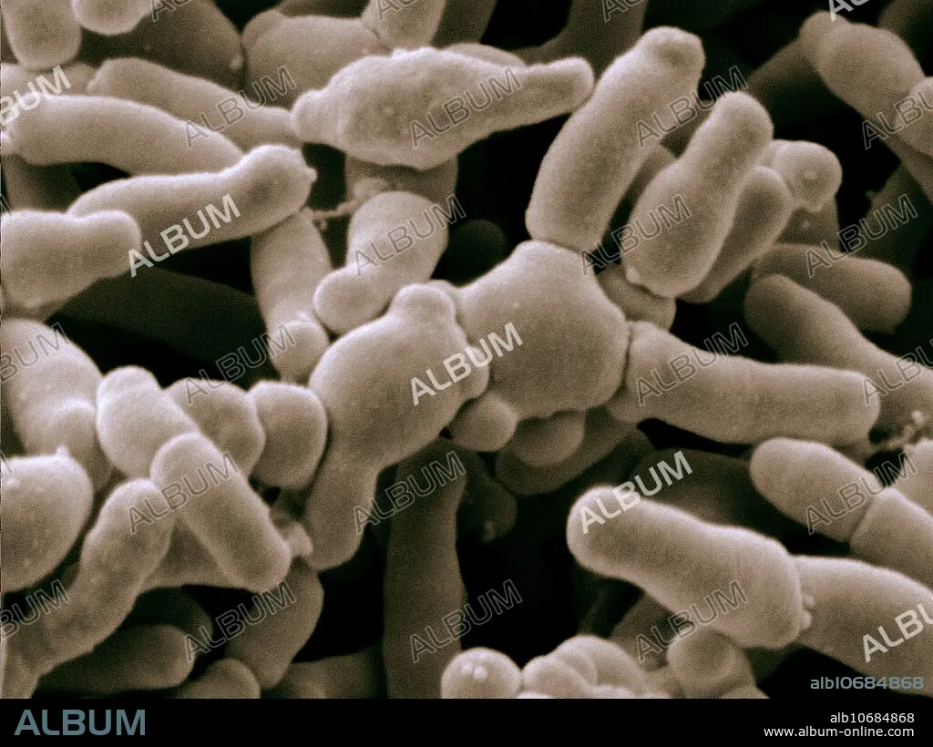 Caption: Colour enhanced scanning electron micrograph (SEM) of bifidobacterium breve. Bifidobacteria are gram-positive, anaerobic, branched rod-shaped bacteria with a very wide variety of species (Bifidobacterium breve shown here). Bifidobacteria have a unique hexose metabolism, called the bifid shunt, which may be used as a diagnostic test for bifidobacteria because it is not found in other gram-positive intestinal bacteria. Bifidobacteria are probiotic, friendly bacteria, which means that they may beneficially affect the host upon ingestion by improving the balance of the intestinal microflora. Image width: 6.4 micrometers. Magnification:15,625x if printed 10 cm wide.