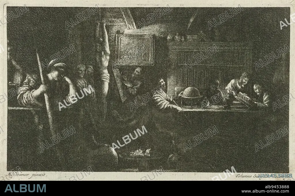 Caption: Minerva as patroness of the arts and sciences, A night piece with Minerva seated on the left with spear in hand and foot on a globe. In the background practitioners of the arts and sciences, including a painter behind an easel with palette in hand., print maker: Johanna Sibilla Küsel, (mentioned on object), after design by: Wenceslaus Hollar, after painting by: Adam Elsheimer, (mentioned on object), Augsburg, 1660 - 1717, paper, etching, height 92 mm × width 148 mm