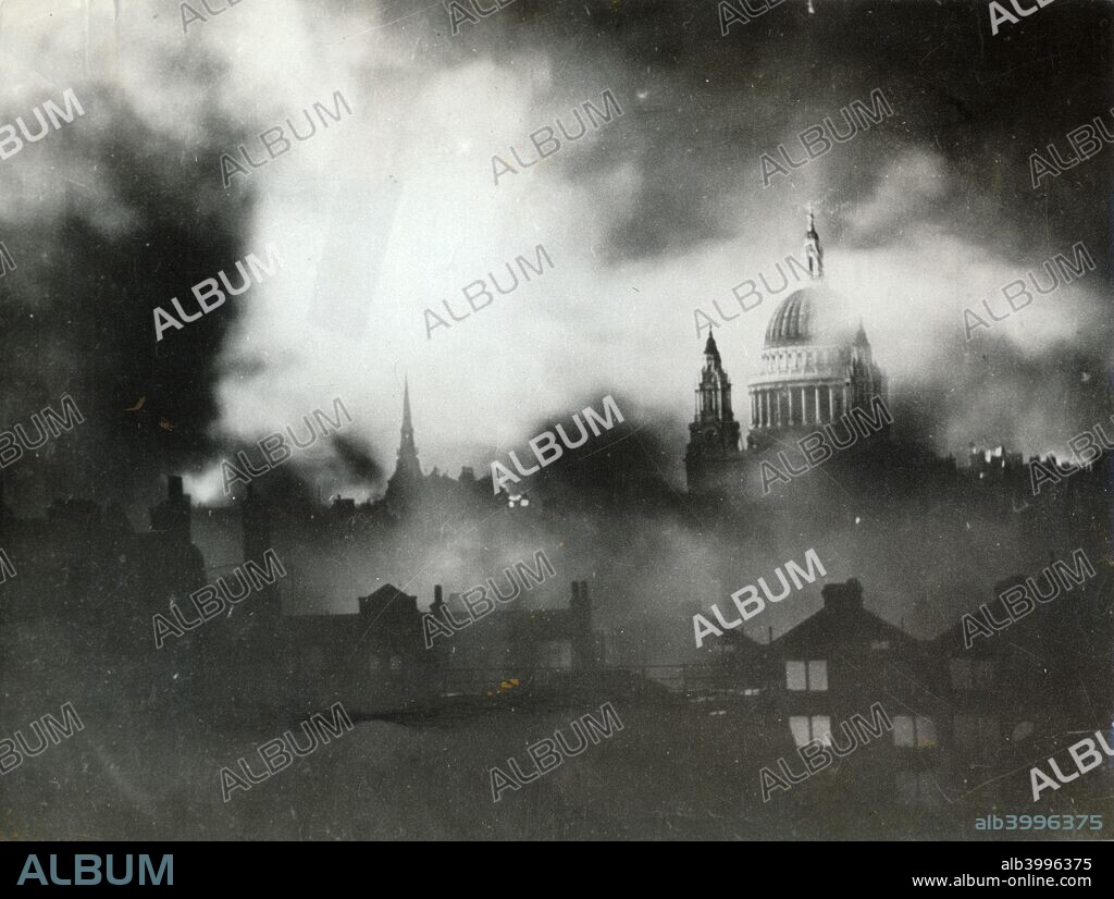 St Paul's Cathedral, London, during the Blitz, World War II, 29 December 1940. This iconic photograph shows the dome of Sir Christopher Wren's cathedral intact as the city around it burns from German incendiary bombs. The raid of 29 December was one of the heaviest on London, causing a firestorm in the City that has been described as the Second Great Fire of London.