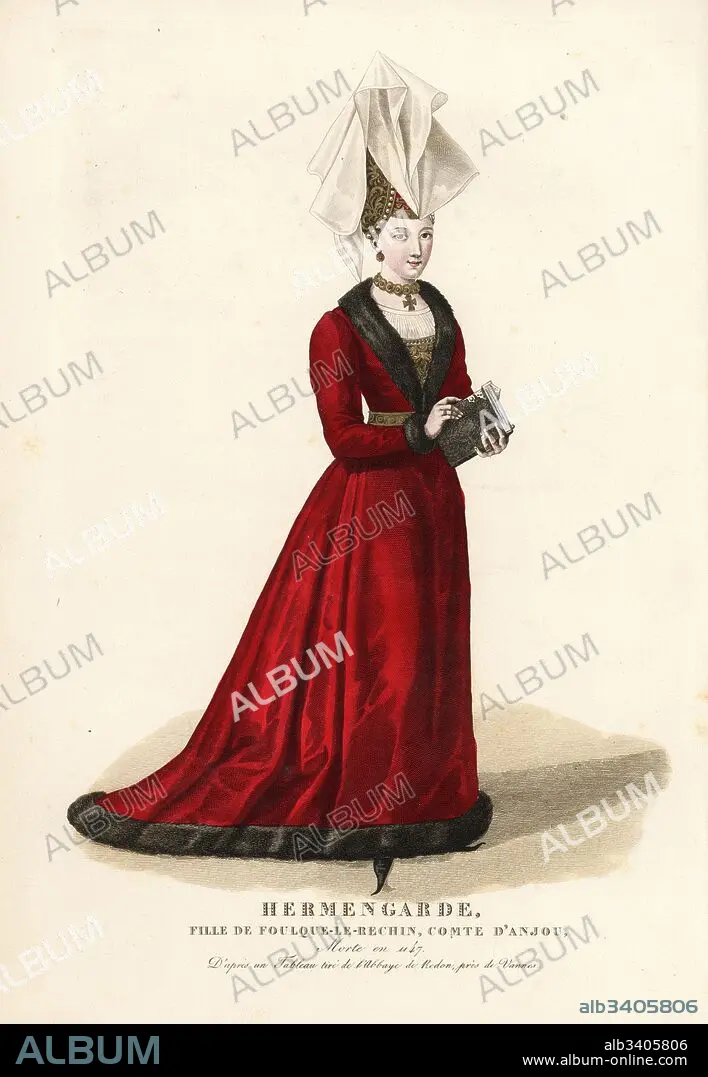 Caption: Ermengarde, daughter of Fulk IV the Quarreler, Count of Anjou, died 1147. In tall headdress with veil, red velvet dress trimmed with fur, long crakows or poulaines, holding a book. From a painting in the Abbey of Redon near Vannes. Handcoloured copperplate engraving by Georges Jacques Gatine after an illustration by Louis Marie Lante from Galerie Francaise de Femmes Celebres, Paris, 1827.