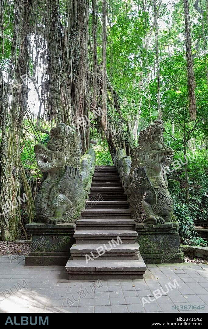 Caption: Two stone dragon statues guarding the stairs at the holy bathing pool of Pura Dalem Agung Padangtegal or Monkey Forest Temple, Ubud, Bali, Indonesia, Asia
