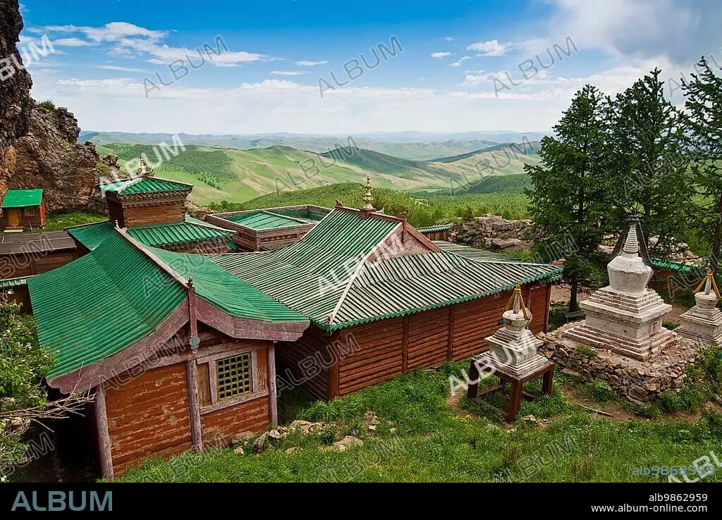 Caption: Buddhist Monastery with Chörten in the Mountains of Khangai Nuruu National Park, Tövkhön Khiid, Orkhon Khürkhree, Kharkhorin, Övörkhangai Aimak, Mongolia, Asia