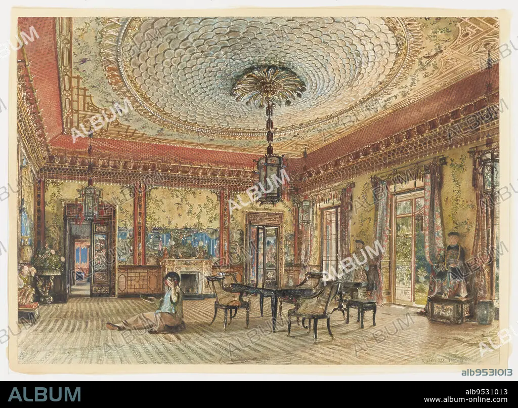 Caption: This salon exhibits a riot of Chinese/Japanese motifs. The walls are hung with wallpaper panels decorated with leaves, birds and large ceramic figures. A lantern, suspended from a palmette canopy centered in the ceiling, is designed in a large circular fish scale pattern. The black japannned and cane furniture is typical of the Victorian period. The floor covering appears to simulate tatami matting. Two large seated statues in costume flank French doors on the right. A mysterious seated figure in the left foreground holds a mask to his face with one hand; an unidentified object, perhaps also a mask, is in the other hand. Date: 1855. Brush and watercolor, gouache, graphite on white paper.